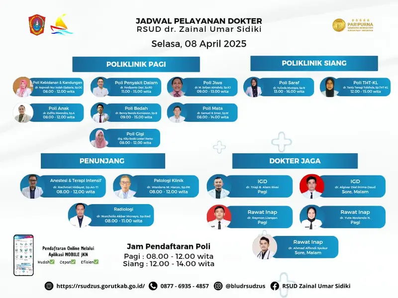 Definitif.id Gorontalo Utara – Rumah Sakit Umum Daerah (RSUD) dr. Zainal Umar Sidiki kembali mengumumkan jadwal praktik dokter untuk hari Selasa, 8 April 2025. Informasi ini mencakup pelayanan poli pagi dan siang, serta dokter jaga dan layanan rawat inap, guna meningkatkan akses masyarakat terhadap layanan kesehatan yang optimal.