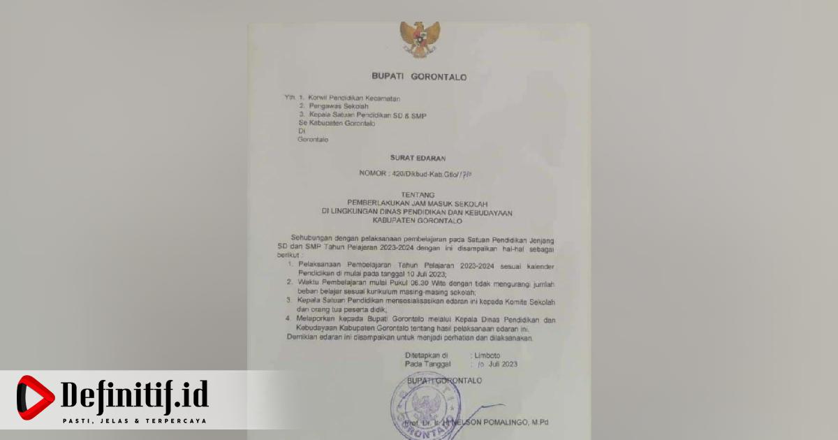 Definitif.id, Gorontalo – Ini alasan Pemerintah Daerah (Pemda) Kabupaten Gorontalo terkait aturan jam masuk sekolah lebih awal di tingkat siswa Sekolah Dasar (SD) dan Sekolah Menengah Pertama (SMP).