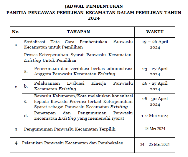 - Peserta Existing yang berasal dari Anggota Panwaslu Kecamatan yang saat ini telah dan atau sedang melaksanakan tugas untuk Pengawasan Pemilu Tahun 2024.