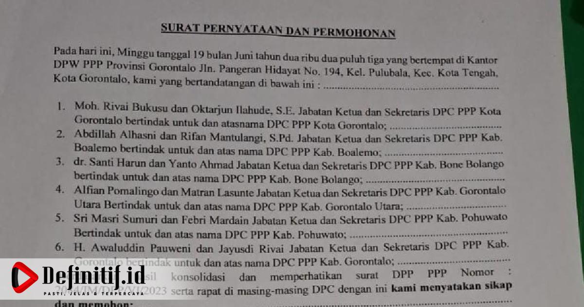 Surat Pernyataan dan Permohonan yang ditandatangani diatas materai 10.000 tersebut berdasarkan hasil konsolidasi dan memperhatikan surat DPP PPP Nomor 2084/IM/DPP/VI/2023 serta rapat di masing-masing DPC.