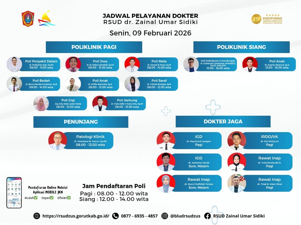 Definitif.id, Gorontalo Utara – Rumah Sakit Umum Daerah (RSUD) dr. Zainal Umar Sidiki kembali menerbitkan daftar lengkap jadwal pelayanan dokter spesialis dan layanan medis lainnya yang akan berlaku pada Senin, 9 Februari 2026. Informasi ini disampaikan oleh pihak rumah sakit dalam upaya memfasilitasi perencanaan kunjungan pasien serta menjaga alur layanan kesehatan yang tertata dan efisien.