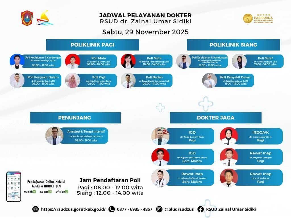 Definitif.id, Gorontalo Utara – Rumah Sakit Umum Daerah (RSUD) dr. Zainal Umar Sidiki (ZUS) mengumumkan jadwal pelayanan dokter untuk hari Sabtu, 29 November 2025. Pengumuman ini dikeluarkan guna memberikan kemudahan bagi masyarakat dalam merencanakan kunjungan layanan medis, terutama pada akhir pekan yang biasanya mengalami peningkatan jumlah pasien.
