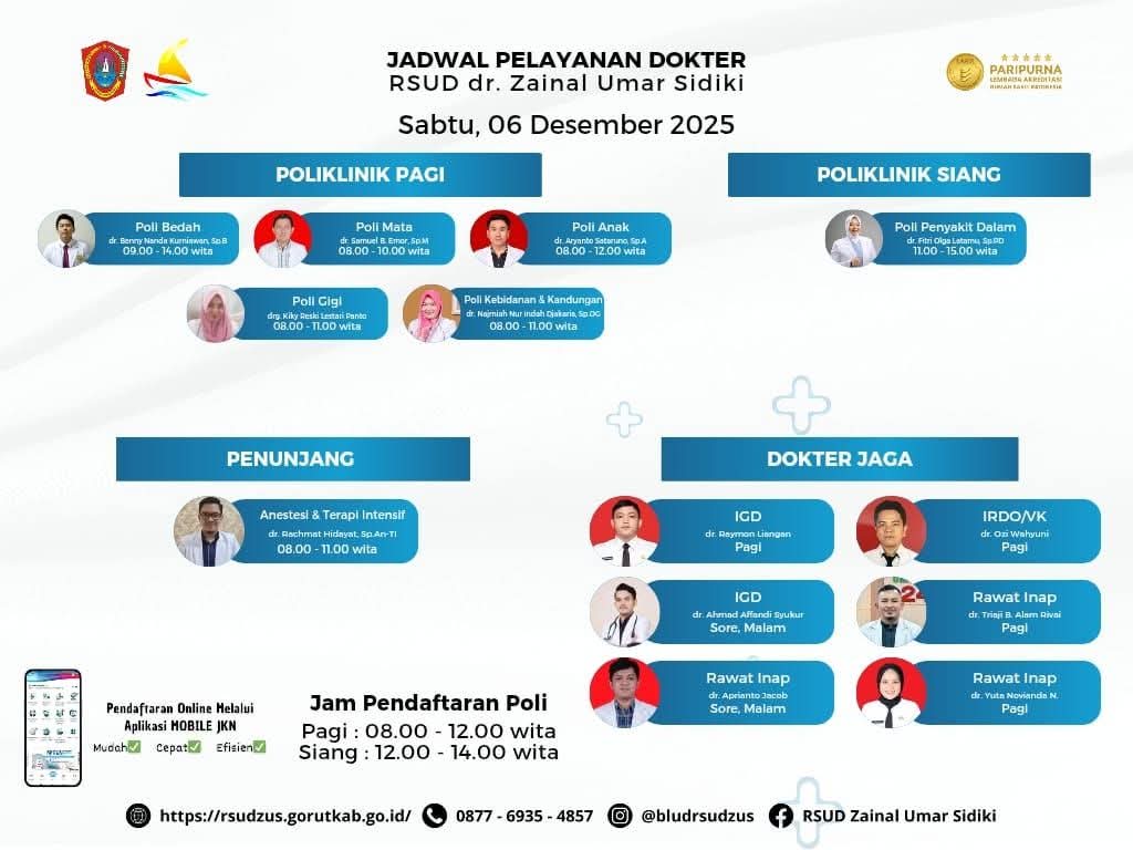 Definitif.id, Gorontalo Utara – Rumah Sakit Umum Daerah (RSUD) dr. Zainal Umar Sidiki (ZUS) kembali merilis jadwal pelayanan dokter untuk hari Sabtu, 6 Desember 2025. Jadwal tersebut meliputi layanan poliklinik pagi dan siang, layanan penunjang, serta penugasan dokter jaga di sejumlah unit pelayanan rumah sakit.