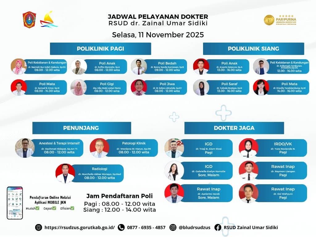 Definitif.id, Gorontalo Utara – Rumah Sakit Umum Daerah (RSUD) dr. Zainal Umar Sidiki (ZUS) kembali merilis jadwal lengkap pelayanan dokter untuk Selasa, 11 November 2025. Informasi ini disampaikan untuk memudahkan masyarakat dalam mengakses layanan kesehatan sesuai poliklinik dan waktu praktik dokter.