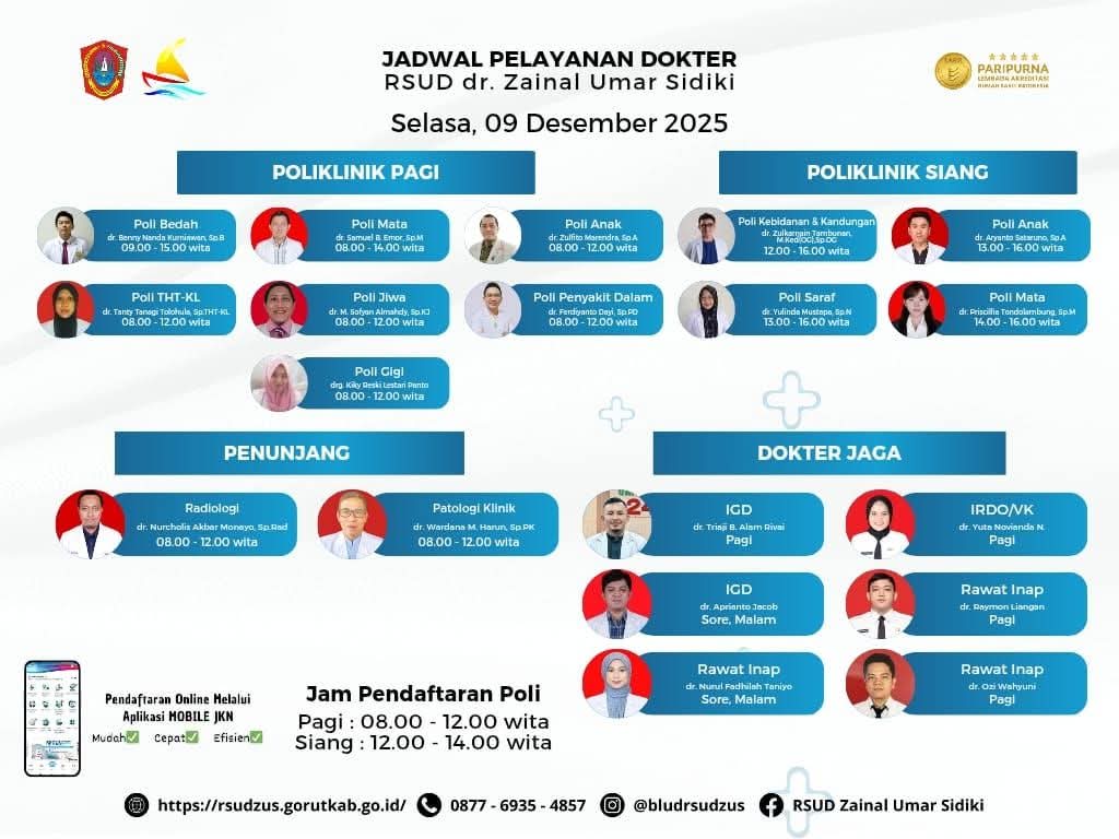 Definitid.id, Gorontalo Utara – Rumah Sakit Umum Daerah (RSUD) dr. Zainal Umar Sidiki (ZUS) resmi merilis jadwal pelayanan dokter untuk Selasa, 9 Desember 2025. Informasi tersebut disampaikan melalui publikasi resmi rumah sakit sebagai bentuk keterbukaan layanan dan peningkatan mutu pelayanan kesehatan kepada masyarakat.