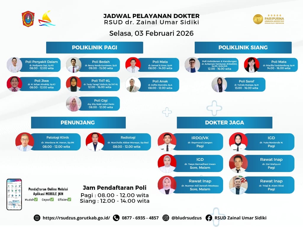 Definitif.id, Gorontalo Utara – Rumah Sakit Umum Daerah (RSUD) dr. Zainal Umar Sidiki merilis jadwal lengkap pelayanan dokter spesialis dan dokter jaga yang akan berlaku pada Selasa, 3 Februari 2026 guna memastikan layanan kesehatan berjalan optimal bagi masyarakat.
