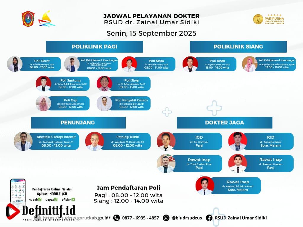 Definitif.id, Gorontalo Utara – Rumah Sakit Umum Daerah (RSUD) dr. Zainal Umar Sidiki (ZUS) kembali mengumumkan jadwal pelayanan dokter untuk Senin, 15 September 2025. Informasi tersebut disampaikan guna memastikan masyarakat dapat mengatur waktu berobat dengan mudah serta memperoleh layanan kesehatan sesuai kebutuhan.