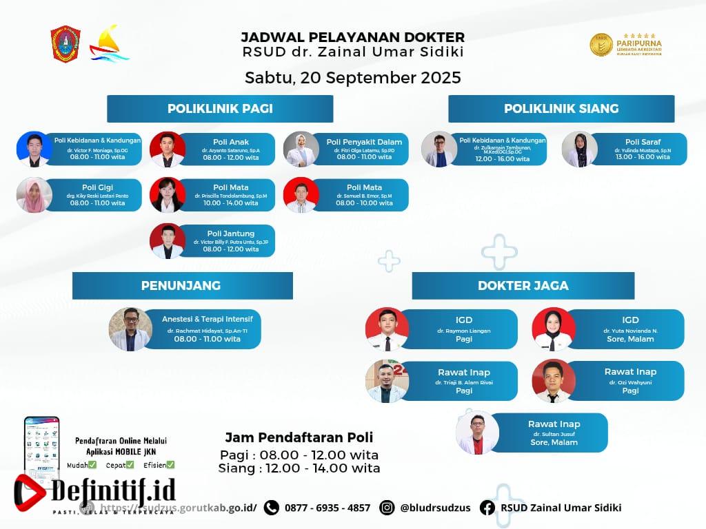 Definitif.id, Gorontalo Utara – Di saat sebagian warga menikmati waktu istirahat pada akhir pekan, Rumah Sakit Umum Daerah (RSUD) dr. Zainal Umar Sidiki (ZUS) Gorontalo Utara justru tetap aktif memberikan pelayanan kesehatan bagi masyarakat. Pada Sabtu, 20 September 2025, rumah sakit ini memastikan seluruh pelayanan dokter spesialis tetap berjalan seperti biasa.