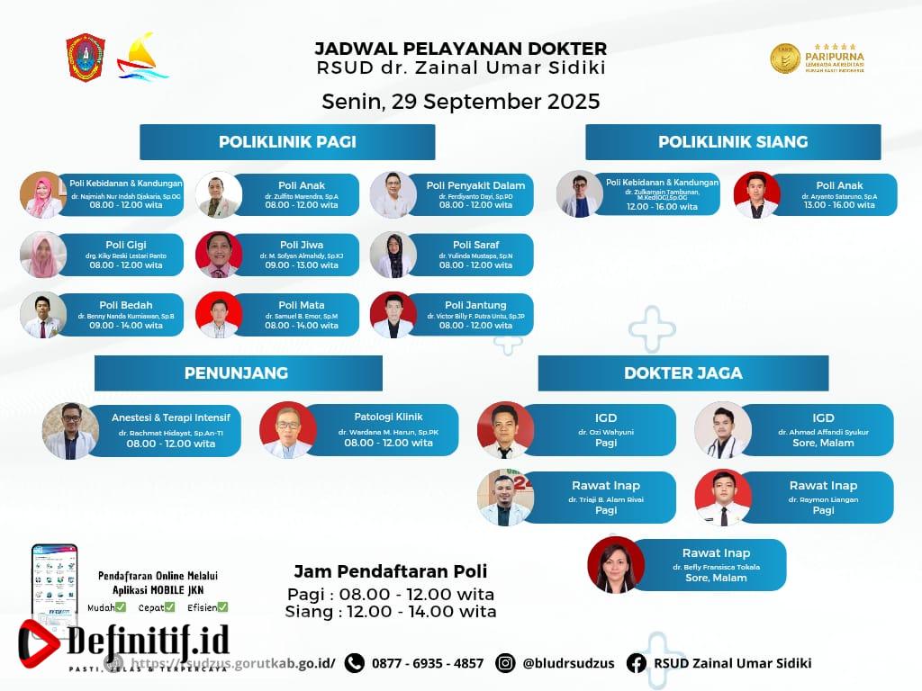 Definitif.id, Gorontalo Utara — Rumah Sakit Umum Daerah (RSUD) dr. Zainal Umar Sidiki (ZUS) Gorontalo Utara kembali menegaskan komitmennya dalam memberikan pelayanan kesehatan yang terencana dan berkualitas. Pada Senin (29/9/2025), pihak rumah sakit mengumumkan jadwal praktik dokter spesialis di berbagai poliklinik, baik untuk sesi pagi maupun siang.